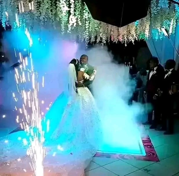 Luzes negras,teto de lagrimas decoração na estrutura com flores,fumo,fogo de artificio,vinil grande 8/8com nome dos noivos.